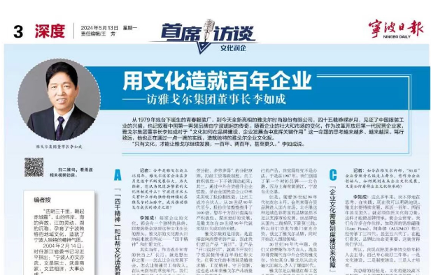 【聚焦】李如成:用文化造就百年企业!《宁波日报》5月13日整版刊发专访文章